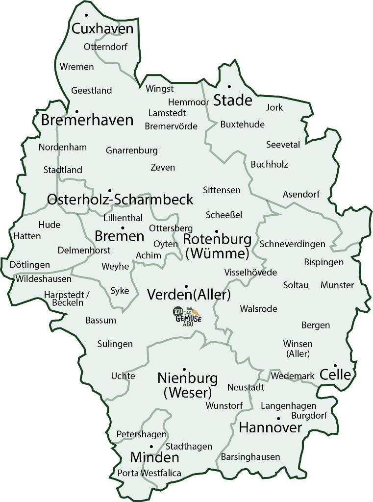 Wir sind Das Gemüseabo aus Dörverden. Seit 1997 sind wir als Biokiste-Lieferservice aus der Region für dich unterwegs und beliefern dich mit 100% biologischen Lebensmitteln. Unser Liefergebiet umfasst die Region Bremen, das Herz Niedersachsens und die Nordseeküste bei Cuxhaven.