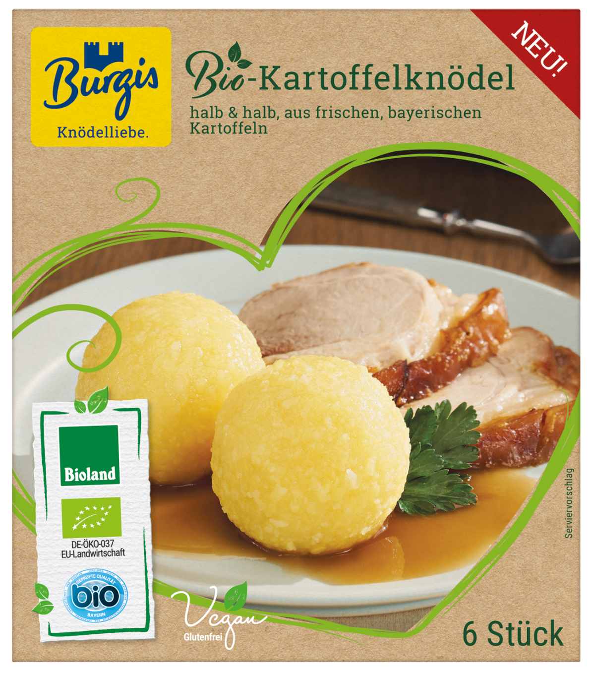Die Burgis Juradistl-Bio-Kartoffelknödel wurden auf der Biofach 2022 vom Bayerischen Staatsministerium für Ernährung, Landwirtschaft und Forsten als innovatives Leuchtturmprojekt der Initiative “30 für 30” ausgezeichnet. Sie möchte die Vorteile der Kennzeichnung von Bio-Ware aus Bayern, deren Erkennbarkeit und damit auch die Marktposition heimischer Bio-Ware unterstützen. Dadurch wird zu „mehr Bio aus Bayern“ und zum Ziel des Programms BioRegio 2030 beigetragen, wonach 30 Prozent der landwirtschaftlichen Flächen Bayerns im Jahr 2030 ökologisch bewirtschaftet werden sollen. Weitere Infos zur Initiative “30 für 30” unter www.biosiegel.bayern/de/30fuer30