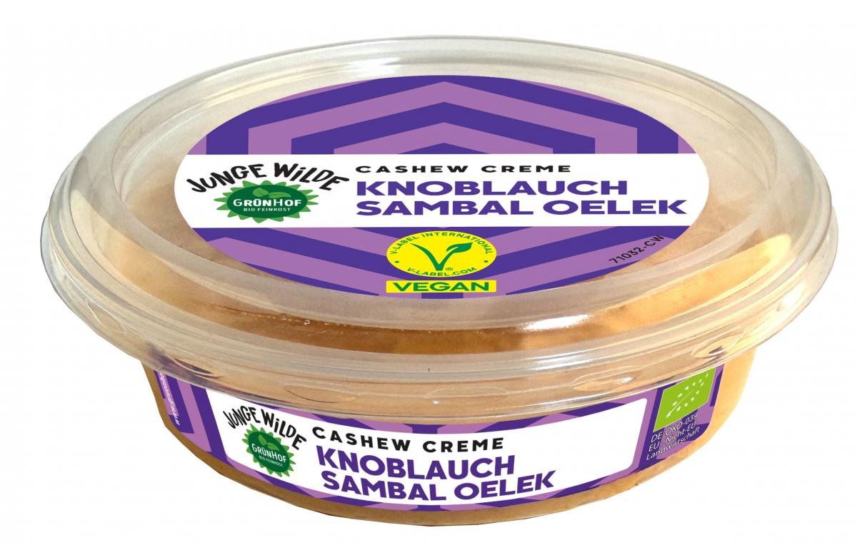 Veganer Aufstrich auf Cashew-Basis mit 15% Cashewkernen, 10% Knoblauch und 2,8% Chili.