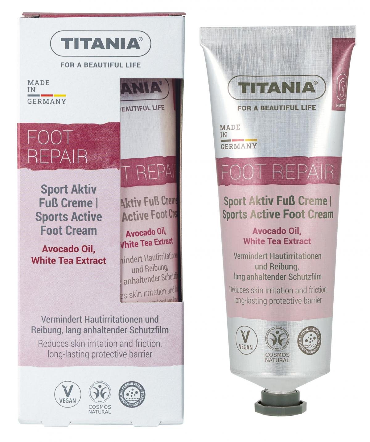 Die vegane Sport Aktiv Fuß Creme von TITANIA® pflegt trockene, strapazierte Füße mit Avocadoöl und weißem Tee Extrakt. Sie bildet einen langanhaltenden schützenden Film auf der Haut und wirkt so vorbeugend