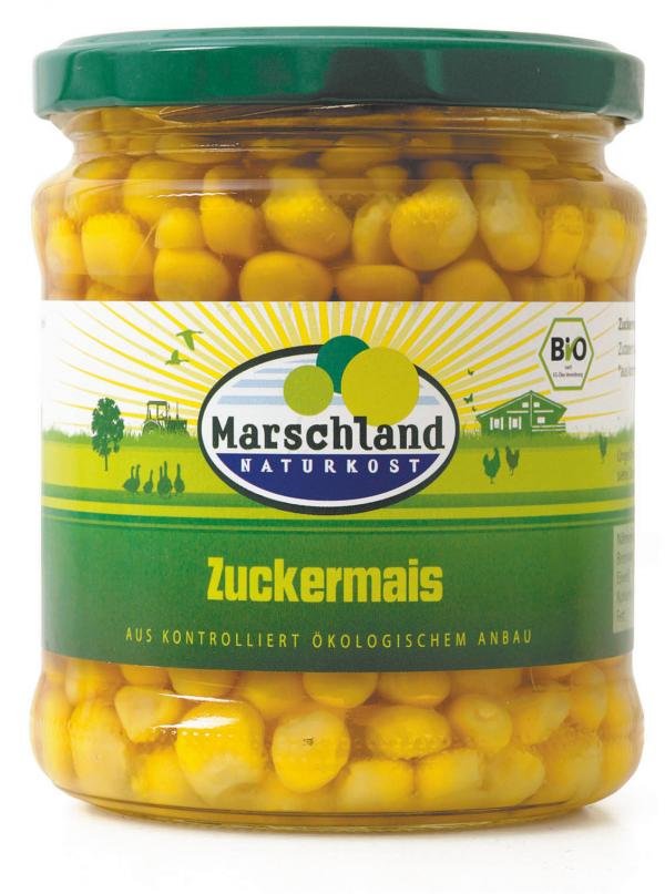 Tafelfertig zubereiteter biologischer Mais, der frisch nach Zusatz eines biologischen Aufgusses durch Pasteurisation in einem luftdicht verschlossenen Behältnis haltbar gemacht worden ist.