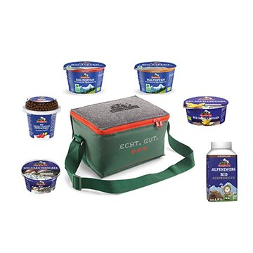 Enthält je 1x Alpenzwerg Schokomilch, Bayerischer Topfen Rahmstufe, Bayerischer Topfen halbfett, Kräuterquark, Vanille Quark 20% und Joghurt Frucht Knusper Hmibeere.