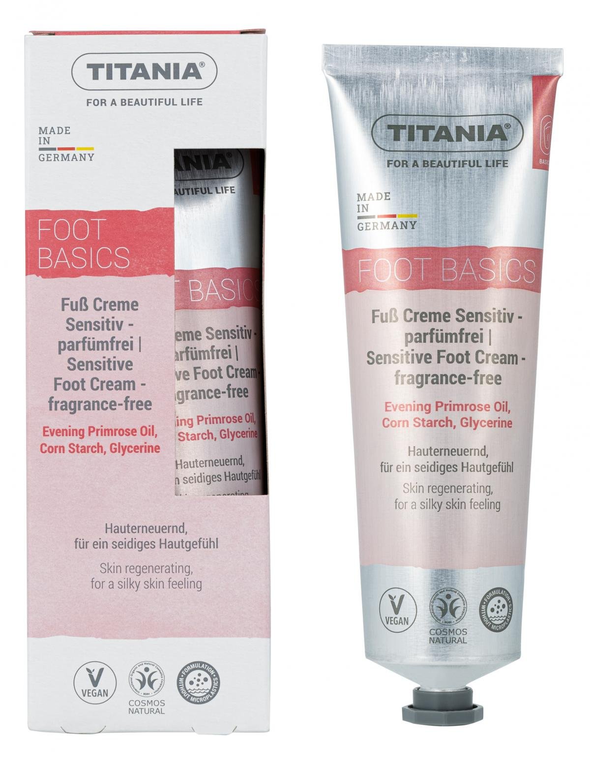 Die TITANIA® Sensitiv Fuß Creme - parfümfrei pflegt und stärkt die Hautbarriere mit Kokos-, Mandel- und Avocadoöl. Nachtkerzenöl unterstützt die Erneuerung der Hautzellen. Die Feuchtigkeitsversorgung