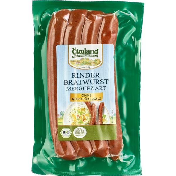 Mit bestem Bio-Rindfleisch, angenehm körniger Fleischeinlage und herzhaft gewürzt nach nordafrikanischem Vorbild mit leichter Schärfe. Das Brühen und das milde Räuchern verleihen der Ökoland Rinder-Bratwurst Merguez Art ihre Haltbarkeit. So bekommt diese nordafrikanische Spezialität ihren besonderen Ökoland-Charakter. Ohne Nitritpökelsalz und andere Zusatzstoffe hergestellt.
