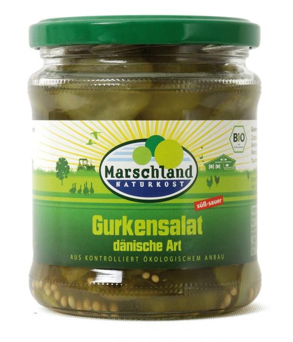 Tafelfertig zubereitete in Scheiben geschnittene biologische Gurken, die frisch nach Zusatz eines Aufgusses durch Pasteurisation in einem luftdicht verschlossenen Behältnis haltbar gemacht worden sind.