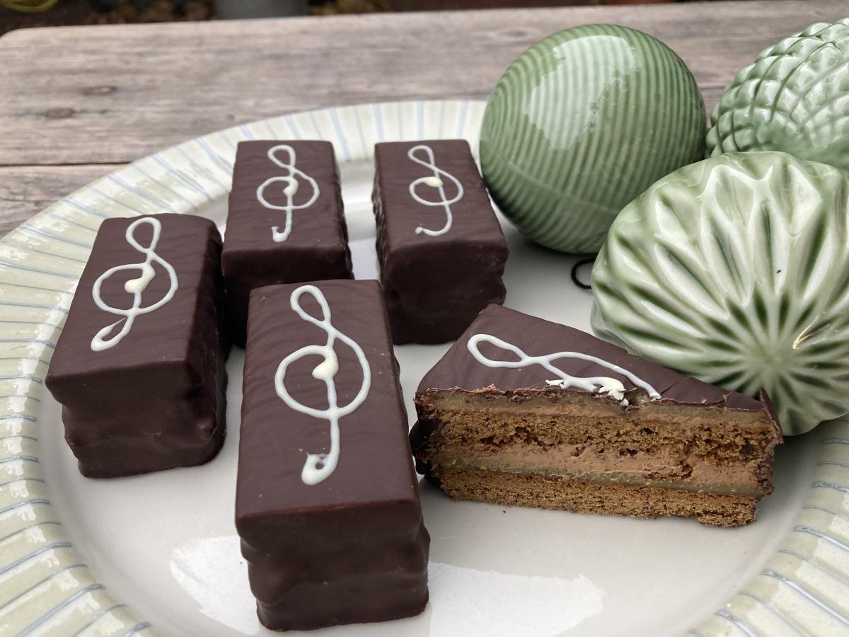 HONIGMARZIPAN* (MANDELN* (52% absolut), Bienenhonig*, Wasser), Zartbitterkuvertüre* (Kakaomasse*, Rohrohrzucker*, Kakaobutter*, Vanillepulver*. [Kakaoanteil mind. 57%]), NUSSNOUGAT* (Rohrohrzucker*, HASELNÜSSE*, Kakaomasse*, Kakaobutter*), DINKELVOLLKORNMEHL* ², BUTTER*, Rohrohrzucker*, Zuckerrübensirup*, EIER*, PISTAZIEN*, Kirschwasser*, WEISSE KUVERTÜRE* (Rohrohrzucker*, Kakaobutter*, VollMILCHpulver*, Vanillepulver*), Weinsteinbackpulver (Säuerungsmittel [Monokaliumtartrat], Backtriebmittel [Natriumhydrogencarbonat], Maisstärke*), Lebkuchengewürz* (Zimt*, Anis*, Piment*, Koriander*, Nelke*, Ingwer*), Meersalz. ²= (UR-WEIZEN)