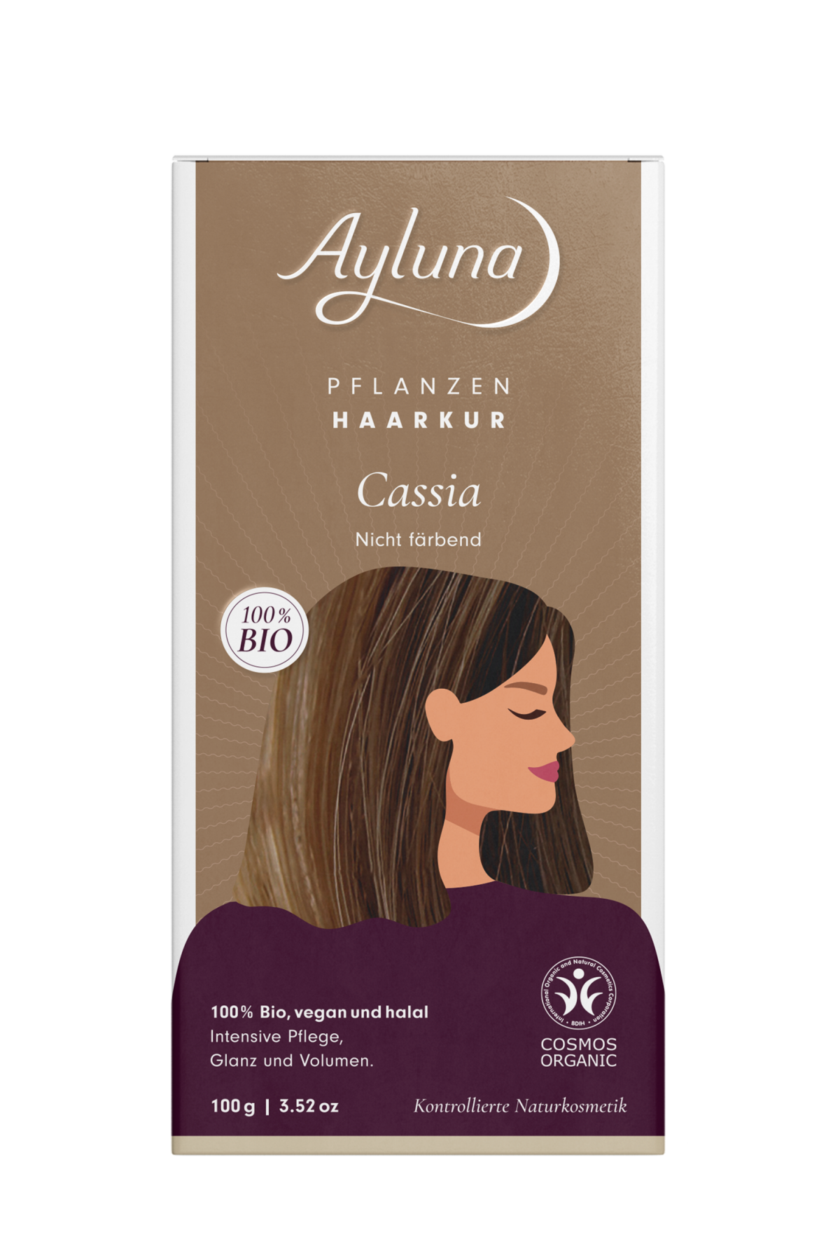 Intensive Pflege, Glanz und Volumen. Ayluna Pflanzenhaarkur Cassia pflegt intensiv und umschließt jedes einzelne Haar mit einer schützenden Lasur von Bio-Pflanzenauszügen. Schenkt feinem, langen oder strapazierten Haar Glanz und Volumen. Cassia, auch farbloses Henna genannt, ist ein traditionelles natürliches Haarpflegemittel. Pflanzenhaarkur Cassia färbt nicht, kann aber auf blondem oder grauem Haar eine leichte Tönung hinterlassen. Frei von Farb-, Duft- und Konservierungsstoffen. 100 % aus kontrolliert biologischem Anbau.