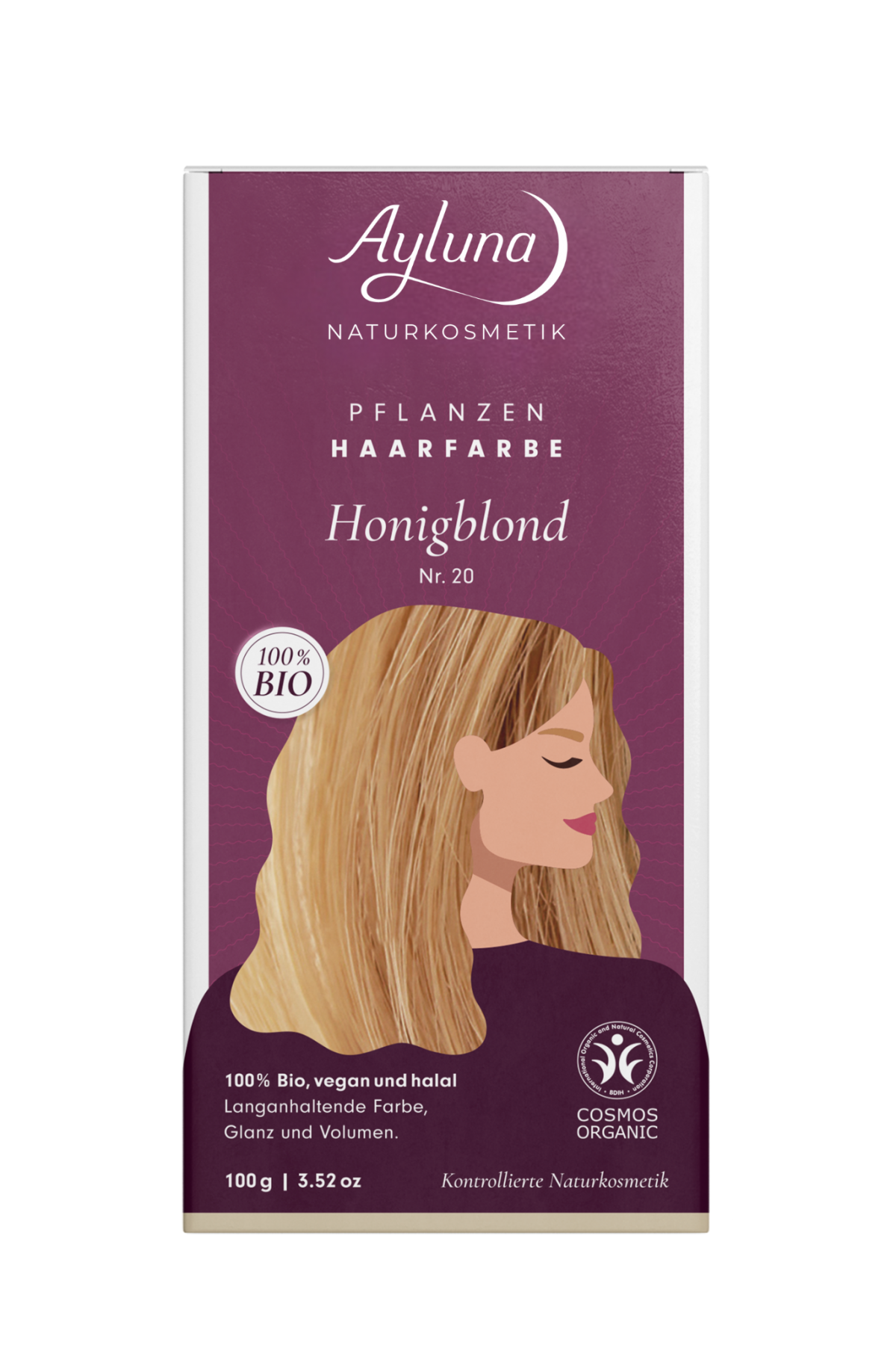 Besonders geeignet für hellblondes bis mittelblondes Haar. Ayluna Pflanzenhaarfarbe umschließt jedes einzelne Haar mit einer schimmernden Lasur ausgewählter Bio-Pflanzenauszüge. In Verbindung mit der natürlichen Ausgangshaarfarbe entstehen ausdrucksvolle, lebendige Farbtöne, Glanz und Volumen. Schonend und langanhaltend. Anders als chemische Haarfarben lässt Ayluna Pflanzenhaarfarbe die natürliche Haarstruktur unangetastet. Frei von Ammoniak, Peroxiden, Resorcin, PEGs, Duft- und Konservierungsstoffen. Nicht aufhellend. Für graues Haar geeignet. 100 % aus kontrolliert biologischem Anbau.